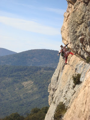 El caso es que para cuando llegamos, todos ya iban hacia la pared, y nosotros aún no sabíamos ni qué escalar. Al final nos decidimos por repetir Tierra de Nadie. Los dos ya la habíamos escalado, pero por separado, y además no nos acordábamos casi de la vía, Dani pk hacía muchos años q la había escalado, y yo, pk cuando subí, me arrastré de mala manera, así que cada uno tenía su objetivo, el mío, hacerla dignamente y Dani encadenar. Los dos cumplimos! :-)